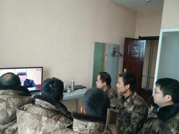兵器工業(yè)集團(tuán)江麓集團(tuán)試驗(yàn)隊(duì)在寒冷的漠河收看慶祝改革開放40周年大會(huì)直播。