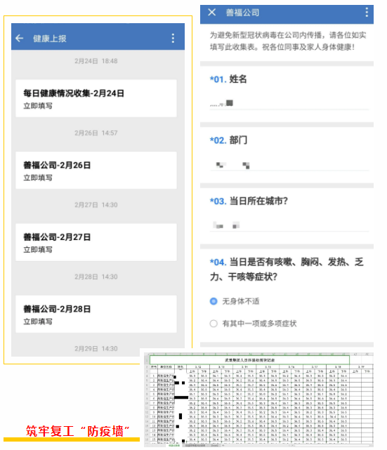 “復(fù)工任務(wù)雖急,人員安全更重,必須把好人員進(jìn)場第一關(guān)?!痹谌藛T進(jìn)場管控上,武重集團(tuán)建立了這樣一條“硬核規(guī)定”:員工必須每天通過企業(yè)微信提交體溫信息,建立員工健康檔案,筑牢復(fù)工“防疫墻”。