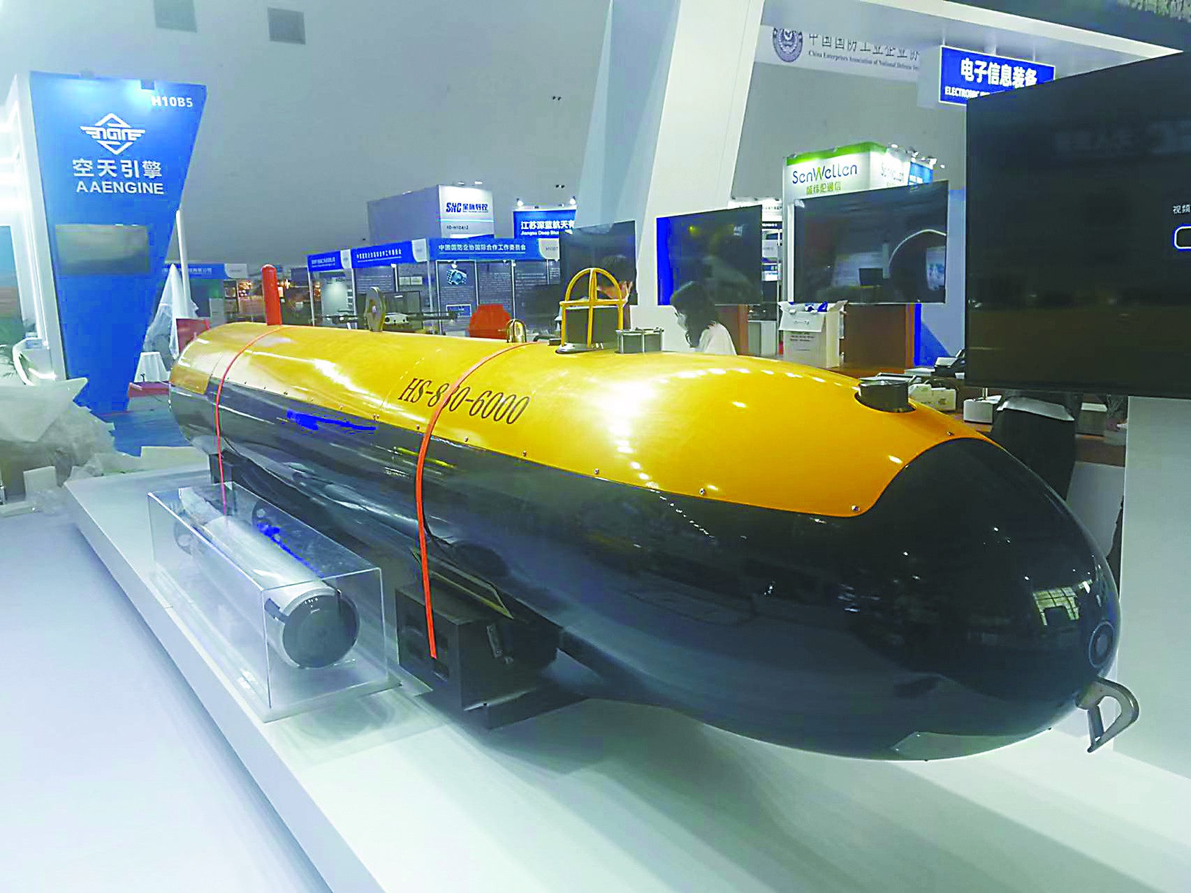 相比公眾相對(duì)熟悉的無人機(jī)和無人車,無人船和無人潛航器的知名度略低,但本屆珠海航展上展出的相關(guān)裝備具備相當(dāng)高的水平。例如HS-880-6000型自主式水下航行器(AUV)就是國內(nèi)首型搜救型無人潛航器。它的最大工作深度達(dá)6000米,能以3節(jié)的速度連續(xù)航行24小時(shí),配備有深水遇險(xiǎn)目標(biāo)高分辨低照度照明系統(tǒng)、聲信標(biāo)定向引導(dǎo)聲吶、水聲探測(cè)側(cè)掃聲吶等,具備工作水深范圍寬、載荷能力大、續(xù)航力長、搜尋探測(cè)能力強(qiáng)等特點(diǎn),可對(duì)深海目標(biāo)全自主精細(xì)搜尋、探測(cè)、定位,執(zhí)行深海水下目標(biāo)搜尋探測(cè)和海洋科學(xué)研究任務(wù)。另一款“守望者”無人潛航器個(gè)頭小巧,配備有光學(xué)探頭、戰(zhàn)斗部和通信設(shè)備,可以自動(dòng)靠近水中或海底目標(biāo)進(jìn)行觀測(cè)、毀傷目標(biāo),用于執(zhí)行反水雷、排障、海底管道巡檢等任務(wù)。