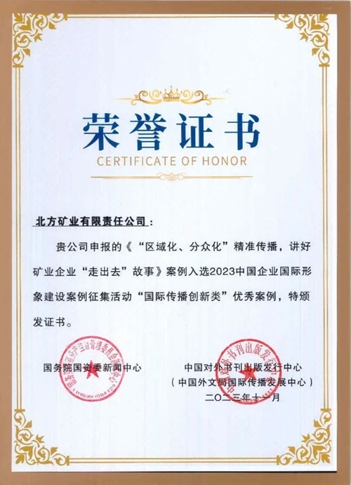 論壇上,“2023中國企業(yè)國際形象建設(shè)案例征集活動(dòng)”評(píng)選結(jié)果揭曉。評(píng)選活動(dòng)以“挖掘典型案例、建設(shè)企業(yè)形象、講好中國故事”為宗旨,從來自中央企業(yè)、地方國企及民營企業(yè)報(bào)送的251個(gè)有效案例中遴選出“共建新絲路”“跨文化融合”“國際傳播創(chuàng)新”“筑夢(mèng)人物故事”四類專項(xiàng)優(yōu)秀案例共40個(gè)。中國兵器工業(yè)集團(tuán)北方公司北方礦業(yè)有限責(zé)任公司案例《“區(qū)域化、分眾化”精準(zhǔn)傳播,講好礦業(yè)企業(yè)“走出去”故事》入選“國際傳播創(chuàng)新類”優(yōu)秀案例。