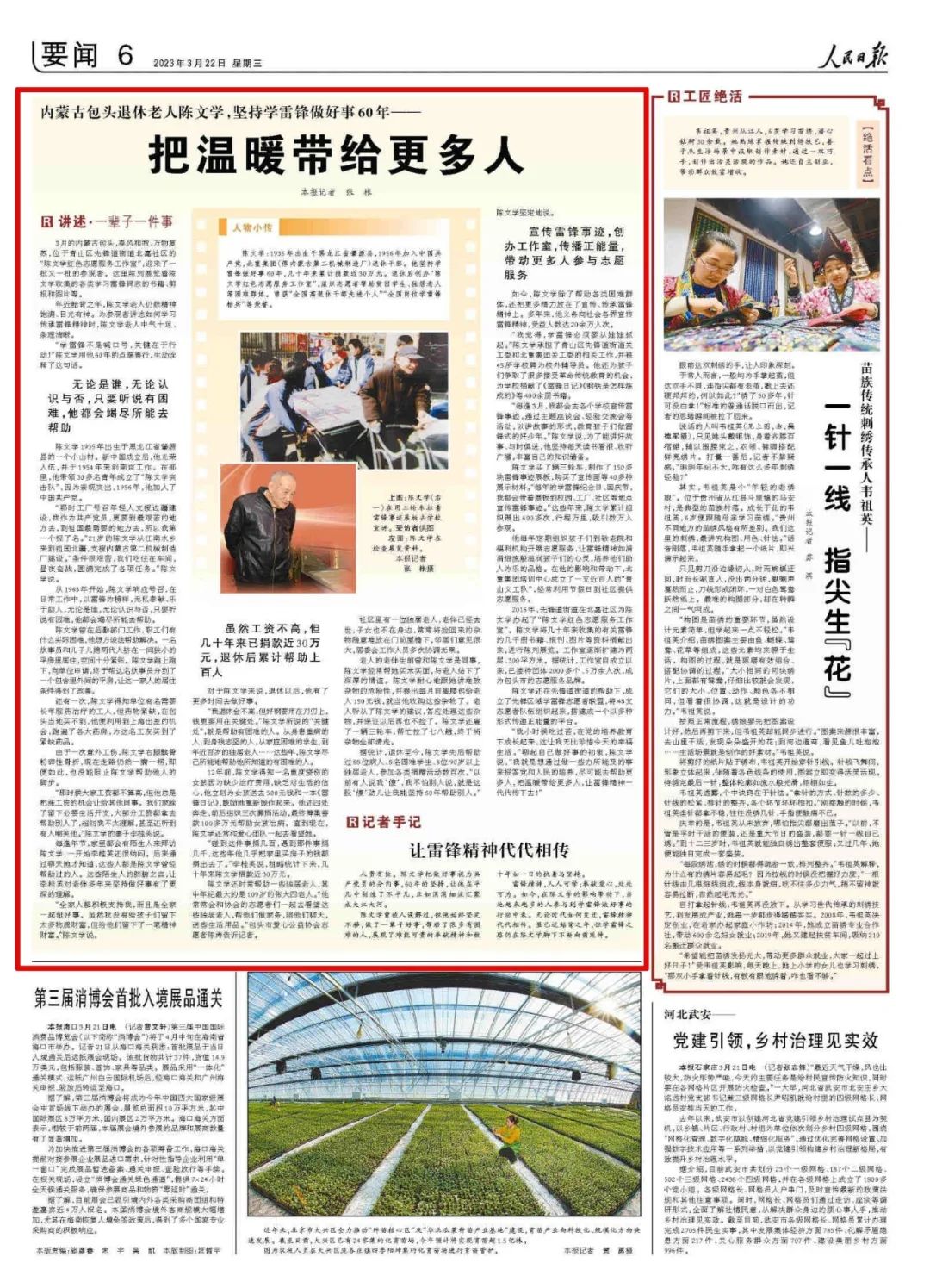 3月22日,《人民日?qǐng)?bào)》刊發(fā)文章《內(nèi)蒙古包頭退休老人陳文學(xué),堅(jiān)持學(xué)雷鋒做好事60年——把溫暖帶給更多人》,講述中國(guó)兵器工業(yè)集團(tuán)北重集團(tuán)退休職工——88歲的陳文學(xué)老人一生學(xué)雷鋒做好事的事跡。人民視頻還對(duì)陳文學(xué)進(jìn)行了專訪。 內(nèi)蒙古包頭退休老人陳文學(xué),堅(jiān)持學(xué)雷鋒做好事60年—— 把溫暖帶給更多人 人物小傳 陳文學(xué):1935年出生于黑龍江省肇源縣,1956年加入中國(guó)共產(chǎn)黨,北重集團(tuán)(原內(nèi)蒙古第二機(jī)械制造廠)退休干部。他堅(jiān)持學(xué)雷鋒做好事60年,幾十年來累計(jì)捐款近30萬元。退休后創(chuàng)辦“陳文學(xué)紅色志愿服務(wù)工作室”,組織志愿者幫助貧困學(xué)生、獨(dú)居老人等困難群體。曾獲“全國(guó)離退休干部先進(jìn)個(gè)人”“全國(guó)崗位學(xué)雷鋒標(biāo)兵”等榮譽(yù)。 3月的內(nèi)蒙古包頭,春風(fēng)和煦、萬物復(fù)蘇,位于青山區(qū)先鋒道街道北嘉社區(qū)的“陳文學(xué)紅色志愿服務(wù)工作室”,迎來了一批又一批的參觀者。這里陳列展覽著陳文學(xué)收集的各類學(xué)習(xí)雷鋒同志的書籍、剪報(bào)和圖片等。 年近鮐背之年,陳文學(xué)老人仍然精神飽滿、目光有神。為參觀者講述如何學(xué)習(xí)傳承雷鋒精神時(shí),陳文學(xué)老人中氣十足、條理清晰。 “學(xué)雷鋒不是喊口號(hào),關(guān)鍵在于行動(dòng)!”陳文學(xué)用他60年的點(diǎn)滴善行,生動(dòng)詮釋了這句話。 陳文學(xué)(右一)在用三輪車?yán)卒h事跡展板去學(xué)校宣講 無論是誰,無論認(rèn)識(shí)與否,只要聽說有困難,他都會(huì)竭盡所能去幫助 陳文學(xué)1935年出生于黑龍江省肇源縣的一個(gè)小山村。新中國(guó)成立后,他光榮入伍,并于1954年來到南京工作。在那里,他帶領(lǐng)30多名青年成立了“陳文學(xué)突擊隊(duì)”,因?yàn)楸憩F(xiàn)突出,1956年,他加入了中國(guó)共產(chǎn)黨。 “那時(shí)工廠號(hào)召年輕人支援邊疆建設(shè),我作為共產(chǎn)黨員,更要到最艱苦的地方去,到祖國(guó)最需要的地方去,所以我第一個(gè)報(bào)了名。”21歲的陳文學(xué)從江南水鄉(xiāng)來到祖國(guó)北疆,支援內(nèi)蒙古第二機(jī)械制造廠建設(shè)?!皸l件很艱苦,我們吃住在車間,晝夜奮戰(zhàn),圓滿完成了各項(xiàng)任務(wù)。”陳文學(xué)說。 從1963年開始,陳文學(xué)響應(yīng)號(hào)召,在日常工作中,以雷鋒為榜樣,無私奉獻(xiàn)、樂于助人,無論是誰,無論認(rèn)識(shí)與否,只要聽說有困難,他都會(huì)竭盡所能去幫助。 陳文學(xué)曾在后勤部門工作,職工們有什么實(shí)際困難,他想方設(shè)法幫助解決。一名炊事員和兒子兒媳兩代人擠在一間狹小的平房里居住,空間十分緊張。陳文學(xué)跑上跑下,向單位申請(qǐng),終于幫這名炊事員分到了一個(gè)包含里外間的平房,讓這一家人的居住條件得到了改善。 還有一次,陳文學(xué)得知單位有名需要長(zhǎng)年服藥治療的工人,但藥物緊缺,在包頭當(dāng)?shù)刭I不到,他便利用到上海出差的機(jī)會(huì),跑遍了各大藥房,為這名工友買到了緊缺藥品。 由于一次意外工傷,陳文學(xué)右腿髕骨粉碎性骨折,現(xiàn)在走路仍然一瘸一拐,即便如此,也沒能阻止陳文學(xué)幫助他人的腳步。 “那時(shí)候大家工資都不算高,但他總是把漲工資的機(jī)會(huì)讓給其他同事。我們家除了留下必要生活開支,大部分工資都拿去幫助別人了,起初我不太理解,甚至還聽到有人嘲笑他?!标愇膶W(xué)的妻子李桂英說。 每逢年節(jié),家里都會(huì)有陌生人來拜訪陳文學(xué),一開始李桂英還很納悶。后來通過聊天她才知道,這些人都是陳文學(xué)曾經(jīng)幫助過的人。這些陌生人的肺腑之言,讓李桂英對(duì)老伴多年來堅(jiān)持做好事有了更深的理解。 “全家人都積極支持我,而且是全家一起做好事。雖然我沒有給孩子們留下太多物質(zhì)財(cái)富,但給他們留下了一筆精神財(cái)富?!标愇膶W(xué)說。 陳文學(xué)在檢查展覽資料。人民日?qǐng)?bào)記者 張棖 攝 雖然工資不高,但幾十年來已捐款近30萬元,退休后累計(jì)幫助上百人 對(duì)于陳文學(xué)來說,退休以后,他有了更多時(shí)間去做好事。 “我退休金不高,但好鋼要用在刀刃上,錢更要用在關(guān)鍵處?!标愇膶W(xué)所說的“關(guān)鍵處”,就是幫助有困難的人。從身患重病的人,到身殘志堅(jiān)的人,從家庭困難的學(xué)生,到年近百歲的獨(dú)居老人……這些年,陳文學(xué)盡己所能地幫助他所知道的有困難的人。 12年前,陳文學(xué)得知一名重度燒傷的女孩因?yàn)槿鄙僦委熧M(fèi)用,缺乏對(duì)生活的信心,他立刻為女孩送去500元錢和一本《雷鋒日記》,鼓勵(lì)她重新振作起來。他還四處奔走,前后組織三次募捐活動(dòng),最終籌集善款100多萬元幫助女孩治病。直到現(xiàn)在,陳文學(xué)還常和愛心團(tuán)隊(duì)一起去看望她。 “碰到這件事捐幾百,遇到那件事捐幾千,這些年他幾乎把家里買房子的錢都捐出去了。”李桂英說,粗略統(tǒng)計(jì)下來,幾十年來陳文學(xué)捐款近30萬元。 陳文學(xué)還時(shí)常幫助一些獨(dú)居老人,其中年紀(jì)最大的是109歲的張大四老人?!八3?huì)和協(xié)會(huì)的志愿者