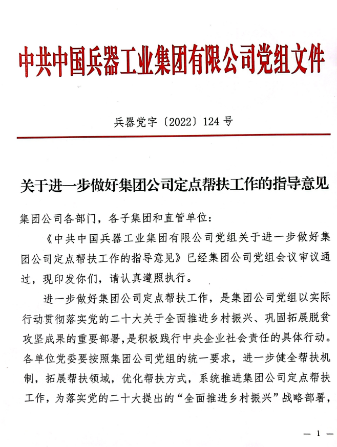 2022年,根據(jù)《中共中央 國(guó)務(wù)院關(guān)于實(shí)現(xiàn)鞏固拓展脫貧攻堅(jiān)成果同鄉(xiāng)村振興有效銜接的意見(jiàn)》《關(guān)于堅(jiān)持做好中央單位定點(diǎn)幫扶工作的意見(jiàn)》等規(guī)定,兵器工業(yè)集團(tuán)黨組制訂印發(fā)《關(guān)于進(jìn)一步做好集團(tuán)公司定點(diǎn)幫扶工作的指導(dǎo)意見(jiàn)》,形成“1+8+5”兵器特色定點(diǎn)幫扶工作體系?!?”,即圍繞“助力全面推進(jìn)鄉(xiāng)村振興、建設(shè)宜居宜業(yè)和美鄉(xiāng)村”定點(diǎn)幫扶要求,“8”,即“加強(qiáng)系統(tǒng)策劃、完善幫扶長(zhǎng)效機(jī)制,發(fā)揮比較優(yōu)勢(shì)、助力鄉(xiāng)村產(chǎn)業(yè)振興,增強(qiáng)內(nèi)生動(dòng)力、助力鄉(xiāng)村人才振興,培育文明新風(fēng)、助力鄉(xiāng)村文化振興,踐行‘兩山’理論、助力鄉(xiāng)村生態(tài)振興,加強(qiáng)基層黨建、助力鄉(xiāng)村組織振興,鞏固脫貧成果、加大消費(fèi)幫扶力度,選派掛職干部、立足鄉(xiāng)村建功立業(yè)”等八項(xiàng)重點(diǎn)任務(wù),“5”,即加強(qiáng)組織領(lǐng)導(dǎo)、落實(shí)幫扶資金、做好宣傳引導(dǎo)、增進(jìn)工作交流、強(qiáng)化考核評(píng)價(jià)等五方面工作保障。
